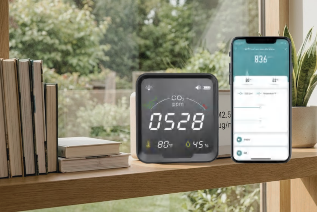 חיישני אקלים ואיכות אוויר: מערך חיישנים המנטר טמפרטורה, לחות ואיכות אוויר (CO2), ומפעיל אוטומטית תרחישי אוורור או מיזוג לשמירה על סביבה בריאה ורעננה בבית.